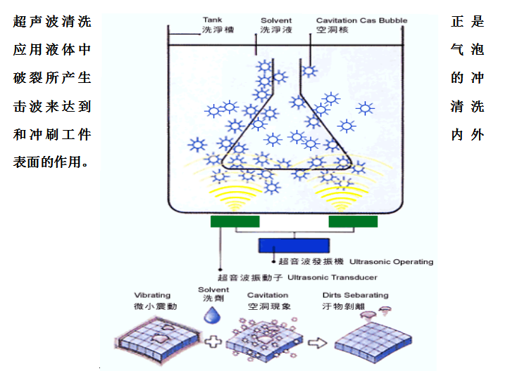 超聲波清洗機(jī)是利用高于20KHZ的超音頻信號(hào),通過換能器轉(zhuǎn)換成高頻機(jī)械振蕩而傳入清洗液中,超聲波在清洗液中疏密相間地向前輻射,使液體流動(dòng)并產(chǎn)生數(shù)以萬(wàn)計(jì)的微小氣泡,這些氣泡是在超聲波縱向傳播形成的負(fù)壓區(qū)形成生長(zhǎng),而在正壓區(qū)迅速閉合,這些氣泡的形成生長(zhǎng)及迅速閉合被稱為空化現(xiàn)象。在空化現(xiàn)象中,這些氣泡的閉合形成超過1000個(gè)大氣壓的瞬間高壓,連續(xù)不斷地瞬間高壓就象一連串小的“爆炸”不停地轟擊物體表面,使物體表面及縫隙之中的污垢迅速剝落,達(dá)到迅速清洗效果。 眾所周知,人們所聽到的聲音是頻率20~20000Hz的聲波信號(hào),高于20000Hz的聲波稱之為超聲波,聲波的傳遞依照正弦曲線縱向傳播,即一層強(qiáng)一層弱,依次傳遞,當(dāng)弱的聲波信號(hào)作用于液體中時(shí),會(huì)對(duì)液體產(chǎn)生一定的負(fù)壓,使液體內(nèi)形成許許多多微小的氣泡,而當(dāng)強(qiáng)的聲波信號(hào)作用于液體時(shí),則會(huì)對(duì)液體產(chǎn)生一定的正壓,因而,液體中形成的微小氣泡被壓碎。經(jīng)研究證明:超聲波作用于液體中時(shí),液體中每個(gè)氣泡的破裂會(huì)產(chǎn)生能量極大的沖擊波,相當(dāng)于瞬間產(chǎn)生幾百度的高溫和高達(dá)上千個(gè)大氣壓,這種現(xiàn)象被稱之為“空化效應(yīng)”,